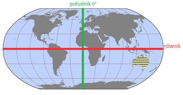 Południk 0° dzieli kulę ziemską na półkulę wschodnią i zachodnią, natomiast równik wyznacza półkulę północną i południową. Kontynentem, który w całości znajduje się na wschód od południka 0° i na południe od równika, jest Australia.