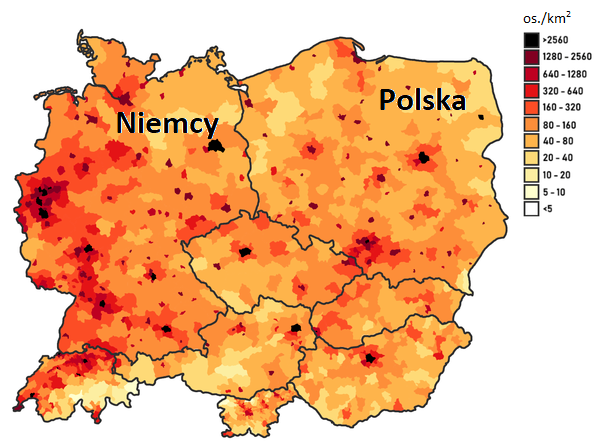 Gęstość zaludnienia Polski wynosi 123 os./km2, natomiast Niemiec – 227 os./km2. Rozmieszczenie ludności jest nierównomierne zarówno w Niemczech, jak i w Polsce.