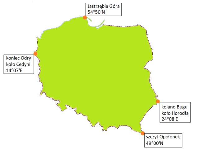 Uzupełnij na mapie nazwy i współrzędne geograficzne skrajnie położonych punktów w Polsce.