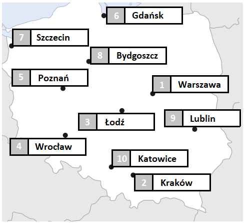 Nazwy poszczególnych miast możesz odczytać z mapy Polski.