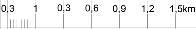 1 cm – 300 m (1 cm na mapie odpowiada 30 000 cm w rzeczywistości, czyli 300 m, czyli 0,3 km).