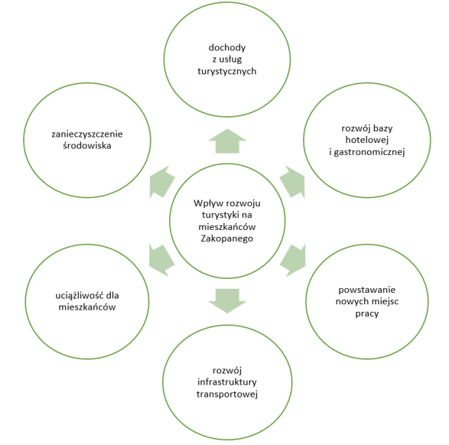 Dochody z usług turystycznych stanowią źródło utrzymania wielu mieszkańców Zakopanego. Napływ turystów zarówno z kraju, jak i z zagranicy, powoduje rozwój bazy hotelowej i gastronomicznej, a co za tym idzie, wpływa na tworzenie nowych miejsc pracy. W regionach turystycznych niezbędna jest dobrze rozwinięta infrastruktura transportowa, dzięki czemu mieszkańcy Zakopanego mogą korzystać z dobrej komunikacji. Natłok turystów może być jednak uciążliwy dla mieszkańców. Przyjmowanie turystów związane jest ze zwiększonym ruchem ulicznym, oblężeniem miejsc odpoczynku i relaksu czy też brakiem miejsc parkingowych. Ponadto zwiększa się zanieczyszczenie powietrza w związku ze wzrostem natężenia ruchu drogowego.