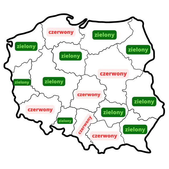 Zaznacz kolorem zielonym te województwa, które mają niższą gęstość zaludnienia od średniej ogólnopolskiej, a kolorem czerwonym te, w których gęstość jest wyższa od średniej krajowej.