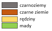 Mady występują w dolinach dużych rzek, które są okresowo zalewane przez wodę. Zajmują ok. 5% powierzchni Polski, a ich największe skupisko występuje na Żuławach Wiślanych. Czarnoziemy, czarne ziemie i rędziny zajmują po ok. 1% powierzchni Polski. Czarnoziemy powstają na skałach lessowych. Czarne ziemie mogą powstawać poprzez naturalne osuszanie bagien. Rędziny powstają na skałach węglanowych i siarczanowych.