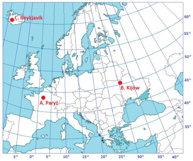 Aby odnaleźć miasto na podstawie podanych współrzędnych geograficznych, należy odszukać na mapie południk i równoleżnik o wskazanych wartościach. Szukane miasto znajduje się w miejscu ich przecięcia.
