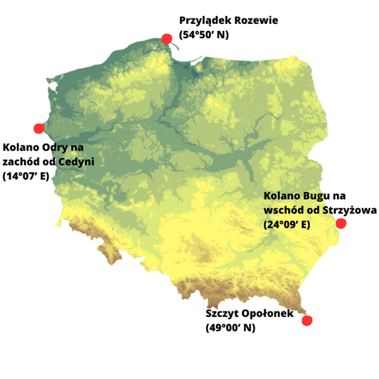 · na północy Przylądek Rozewie – 54°50’ N (szerokości geograficznej północnej),