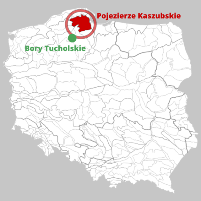 Pojezierze Kaszubskie i Bory Tucholskie znajdują się na północy Polski, szukaj ich w górnej części mapy.