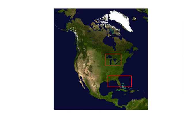 Wielkie Jeziora znajdują się w północnej części kontynentu i łatwo je zauważyć, ponieważ są z każdej strony otoczone lądem. Ich powierzchnia wynosi ok. 244106 km2. Półwysep Floryda znajduje się w południowo-wschodniej części Stanów Zjednoczonych i zajmuje powierzchnię ok. 110 tys. km2. Leży on pomiędzy Zatoką Meksykańską i jest najbardziej narażony na cyklony tropikalne.