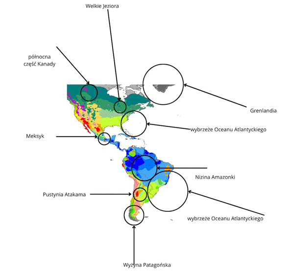 Tereny najmniej zamieszkane oznaczone są najjaśniejszym kolorem, a najbardziej zamieszkane ciemnym odcieniem. W Ameryce najbardziej zaludnione są tereny przy wybrzeżach Oceanu Atlantyckiego, znajdują się tam jedne z największych miast np. Nowy Jork, Miami, Rio de Janeiro. Duża gęstość zaludnienia występuje też przy terenach Wielkich Jezior i w Meksyku – są to miejsca przyjazne dla działalności człowieka z odpowiednim klimatem. Najmniejszą gęstością zaludnienia charakteryzuje się Grenlandia, Północna Kanada z mroźnym klimatem, dodatkowo Nizina Amazonki, na których przeważają lasy i Pustynia Atakama.