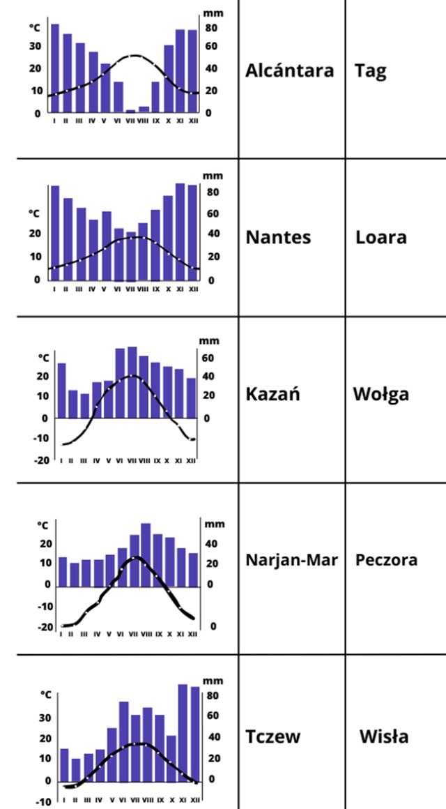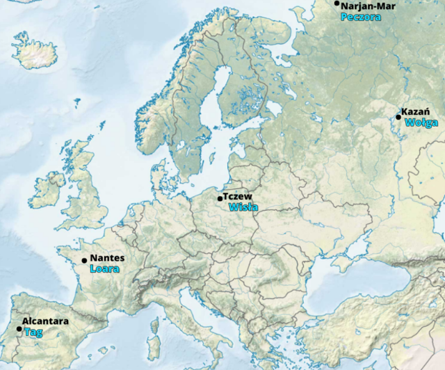 Na podstawie danych, np. w atlasie, zapisz na mapie i w tabeli rzeki, nad którymi leżą podane miasta.