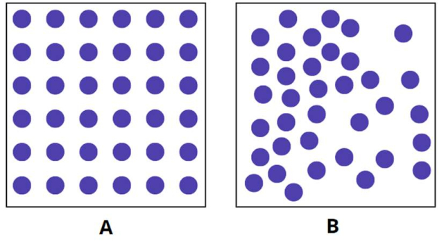 W tym zadaniu musisz narysować 36 kropek równomiernie w kwadracie A, a w kwadracie B – nierównomiernie.
