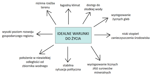 – przyrodnicze: ukształtowanie terenu, klimat, żyzność gleb, dostęp do zasobów wody słodkiej, bliskość zbiorników wodnych, występowanie surowców mineralnych, lesistość, warunki klimatyczne;