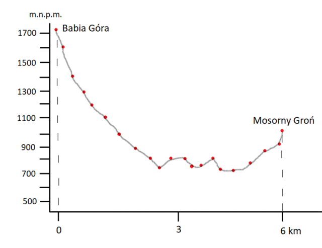 Najpierw narysuj odcinek pomiędzy Babią Górą a Mosornym Groniem na mapie ( odcinek ma 12 cm na mapie co według skali odpowiada 6 km w terenie). Następnie na tym odcinku zaznacz wszystkie punkty, w których odcinek ten przecina się z poziomicami. Narysuj układ współrzędnych i przenieś na niego zaznaczone wcześniej punkty.