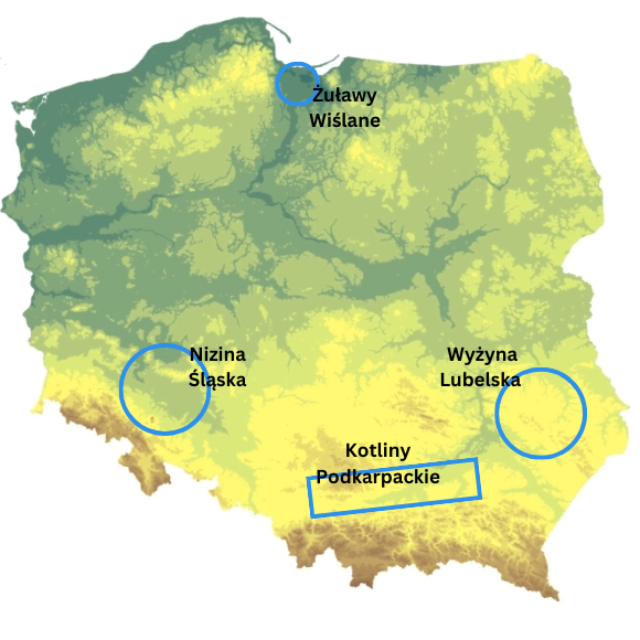 Żuławy Wiślane, Nizina Śląska, Kotliny Podkarpackie, Wyżyna Lubelska