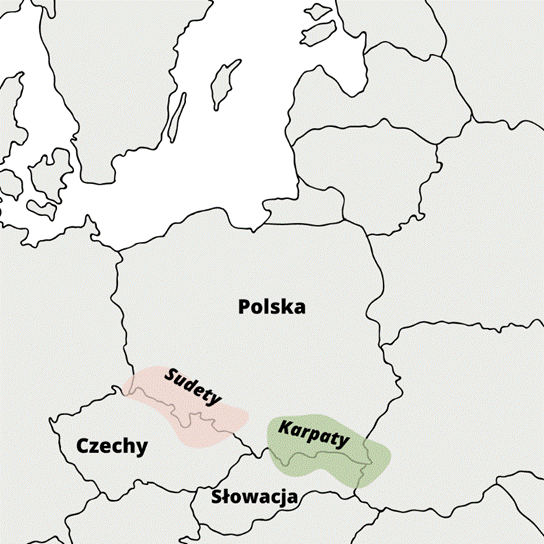 Na poniższej mapie wpisz nazwy takie jak: Czechy, Słowacja, Polska, Karpaty, Sudety, tak aby odpowiadały one ich faktycznej lokalizacji.