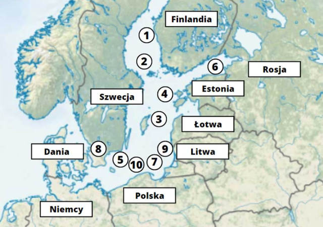 Podpisz na mapie państwa, które mają dostęp do Morza Bałtyckiego, a następnie wpisz w luki numery podanych miejsc.
