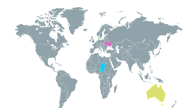 Duży udział łąk i pastwisk w strukturze użytkowania ziemi ma Australia (na zółto) oraz Czad (na niebiesko), co jest związane z występowaniem na terenie tych państw trawiastej formacji roślinnej – sawanny.