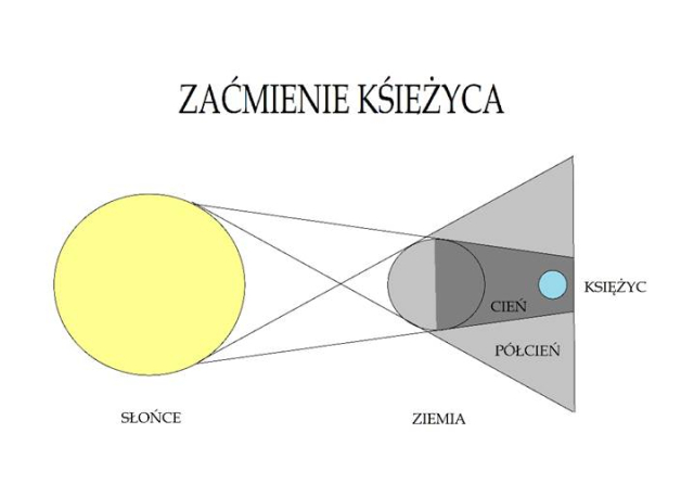 W chwili, w której Słońce, Ziemia i Księżyc są ustawione w jednej linii, dochodzi do zaćmienia. Zaćmienie Księżyca występuje, gdy Ziemia znajduję się pomiędzy Słońcem a Księżycem i nie blokuje mu dostęp do promieni słonecznych.
