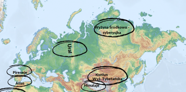 Odszukaj opisane regiony w atlasie i zapisz ich nazwę: góry na granicy Europy i Azji.