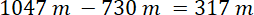 Górna stacja znajduje się na wysokości 1047 m, a dolna 730 m. Odejmując od siebie te dwie wartości, otrzymamy 317 m, które musimy wstawić w miejsce oznaczone literą H we wzorze. Następnie obliczamy długość odcinka spadku terenu, który we wzorze oznaczony jest literą L.