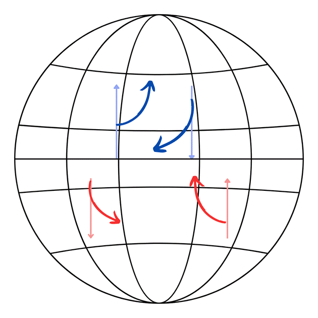 Efekt Coriolisa powoduje, że kierunek wiatru na półkuli północnej jest przesunięty w prawo, a na południowej w lewo.