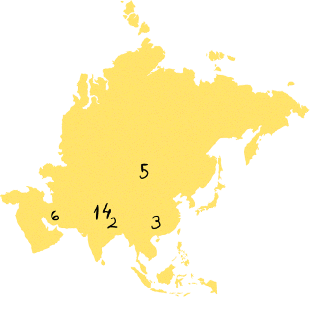 Kotlina Kaszmirska – 1, kotlina Katmandu – 2, kotlina Syczuańska – 3, Himalaje – 4, Sajany – 5, Zagros – 6.