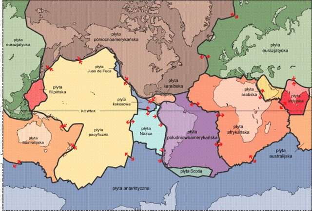 Granice płyt tektonicznych zostały przedstawione orientacyjnie na rysunku:
