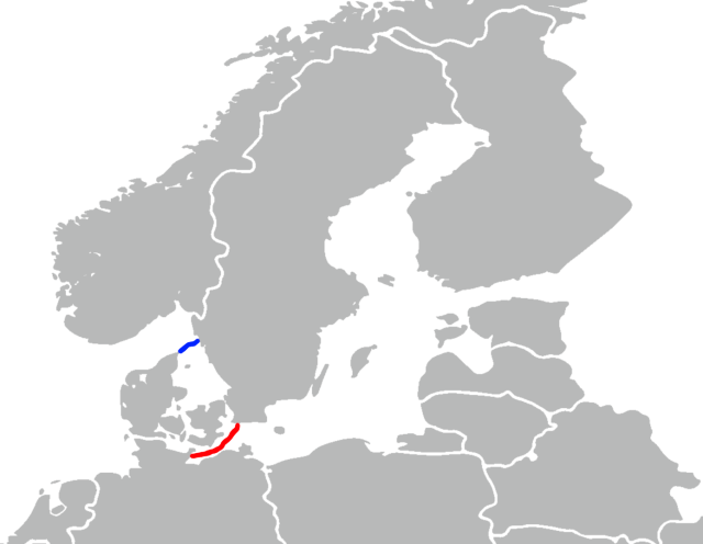 Nie ma pełnej zgodności, co do przebiegu granicy między Morzem Bałtyckim i Morzem Północnym. Istnieją dwie wersje, pierwsza zakłada, że granicę tą wyznacza cieśnina Sund (kolor czerwony), z kolei druga, że przebiega ona od północnego wierzchołka Półwyspu Jutlandzkiego pomiędzy cieśninami Skagerrak i Kattegat (kolor niebieski).