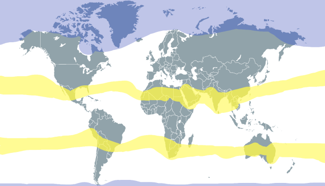Kolorem niebieskim oznaczono strefę klimatów okołobiegunowych, z kolei kolorem żółtym strefę klimatów zwrotnikowych.