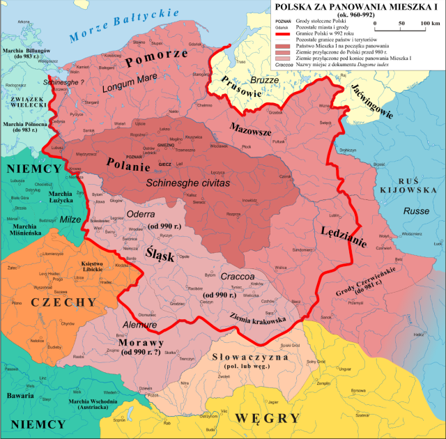 Na początku swojego panowania Mieszko I rządził małym księstwem, ale z czasem zdołał zjednoczyć wiele innych małych księstw, tworząc w ten sposób państwo polskie. Granice Polski pod koniec panowania Mieszka I obejmowały tereny Pomorza Zachodniego, Śląska, Kujaw oraz ziemi lubuskiej.