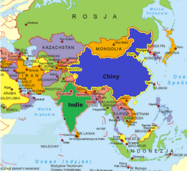 Kolorem zielonym zaznacz terytorium Indii, a niebieskim obszar Chin i podpisz odpowiednie nazwy.