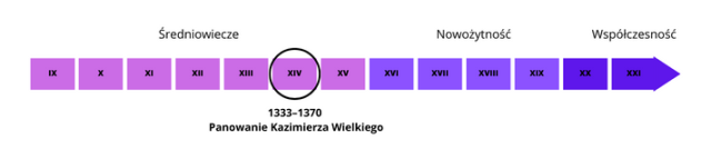 W tym zadaniu musisz zaznaczyć na osi czasu okres panowania Kazimierza Wielkiego. Następnie uzupełnij zdanie, zapisując liczbę lat, przez które królował.