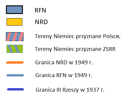 Aby wykonać to zadanie, musisz przypomnieć sobie ustalenia powojenne dotyczące Niemiec. RFN, czyli Republika Federalna Niemiec, to tzw. Niemcy Zachodnie, państwo pod kontrolą aliantów zachodnich. Powstało z trzech stref okupacyjnych (amerykańskie, brytyjskiej i francuskiej), dlatego było znacznie większe niż NRD (Niemiecka Republika Demokratyczna), Niemcy Wschodnie, które powstały z radzieckiej strefy okupacyjnej. Aby zrekompensować Polsce odebranie jej wschodnich terenów, w postanowieniach jałtańskich zawarto postanowienie, że Polska otrzyma część terytorium Niemiec. Pamiętając o tych ustaleniach, bez problemu podpiszesz wszystkie elementy mapki.