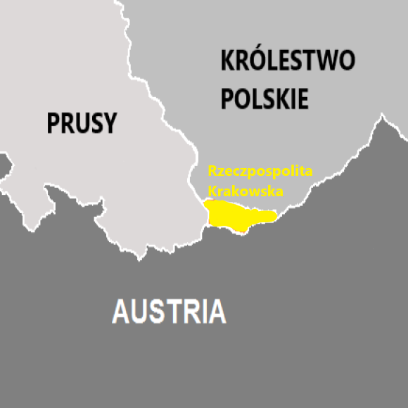 Wolne Miasto Kraków, czyli Rzeczpospolita Krakowska, oznaczone kolorem żółtym, stanowiło obszar zależny od zaborców, jednak cieszący się wysoką autonomią. Zostało utworzone poprzez ustalenia kongresu i obejmowało Kraków oraz jego okolice.