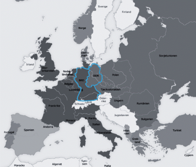 Od 1945 roku Niemcy dzieliły się Niemcy Wschodnie (NRD) i Niemcy Zachodnie (RFN). Niemiecka Republika Demokratyczna powstała na radzieckiej strefie okupacyjnej. Republika Federalna Niemiec została utworzona na strefie okupacyjnej amerykańskiej, brytyjskiej i francuskiej.