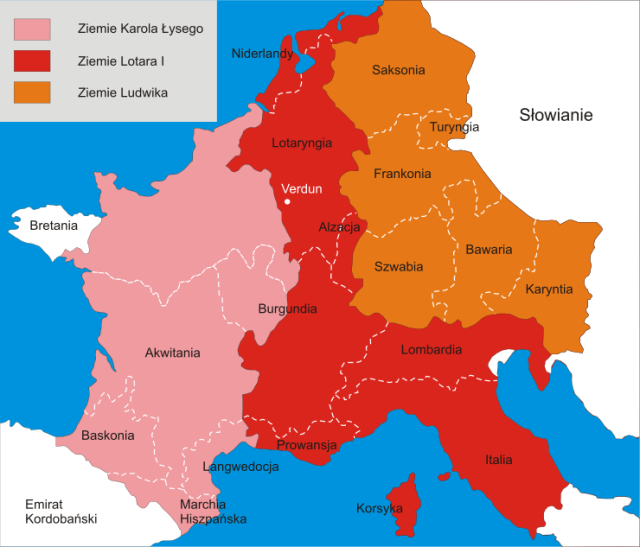W wyniku traktatu w Verdun państwo Karola Wielkiego podzielono pomiędzy trzech władców. Było to porozumienie pomiędzy wnukami Karola Wielkiego – Ludwikiem Niemieckim, Karolem Łysym i Lotarem I. Traktat ten doprowadził do powstania trzech odrębnych państw: Państwa Środka (wcześniej Lotaryngii), Zachodniej Francji i Wschodniej Francji, które później stały się odpowiednio Niemcami, Francją i Wschodnią Francją. W wyniku tego trwałego podziału w Europie rozwinęły się różne kultury i języki.