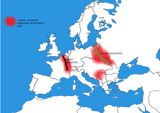 Front zachodni rozpościerał się od granicy szwajcarskiej do Morza Północnego. Front wschodni przebiegał wzdłuż granicy Niemiec i Rosji, a także po jej obu stronach.