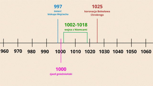 Wydarzenia należy zaznaczyć na osi czasu według następującej kolejności: 997, 1000, 1002-1018, 1025