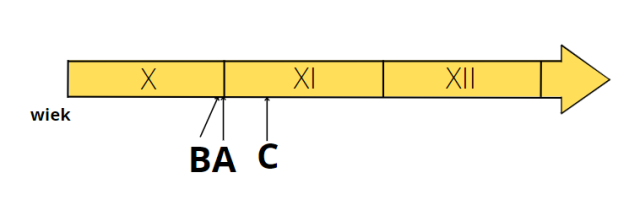 Wydarzenie B i C miały miejsce w X wieku, a wydarzenie A w XI wieku.