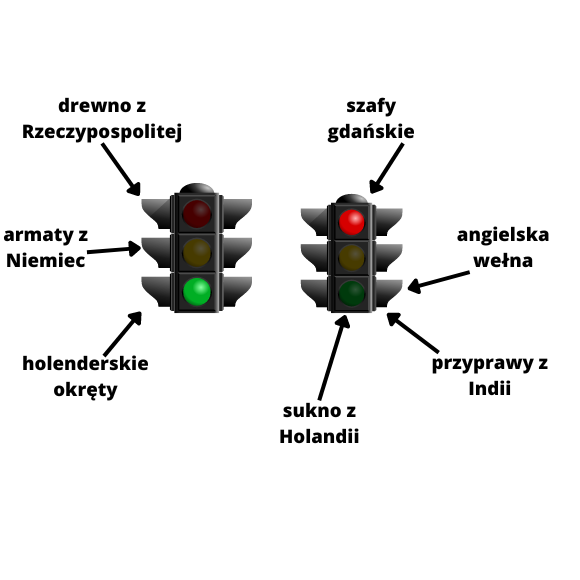 Wskaż, łącząc ze zielonym światłem, towary, które można było importować do Francji, a ze światłem czerwonym te, których nie wolno było.