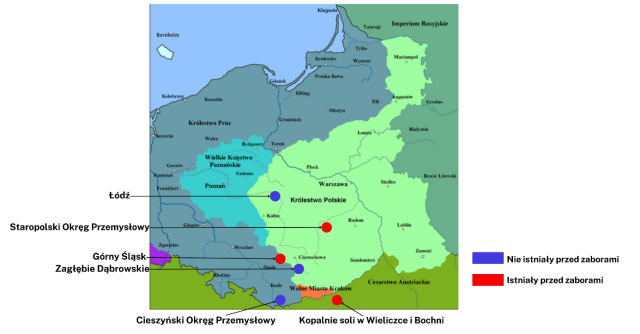 Wskaż na mapie najważniejsze ośrodki przemysłowe na ziemiach polskich w pierwszej połowie XIX w. Które z nich istniały przed zaborami?