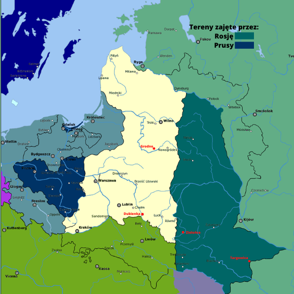 W II rozbiorze Polski Rosja zajęła bardzo duże tereny wschodnie, tzw. kijowszczyznę i okolice Mińska. Prusy zagarnęły natomiast Wielkopolskę, a także kilka znaczących miast, takich jak Gdańsk, Toruń i Poznań oraz okolice Sieradza.