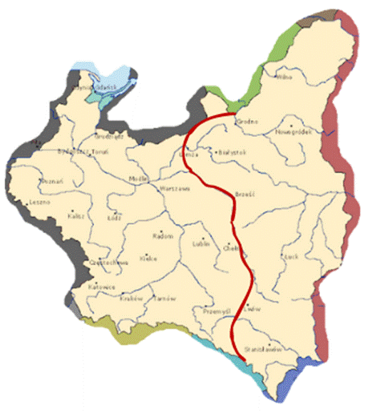 Przeanalizuj mapę Polski podaną w zadaniu i zaznacz na czerwono miejsce, gdzie przechodziła granica niemiecko-sowiecka zgodna z porozumieniem z 28 września 1939 r.