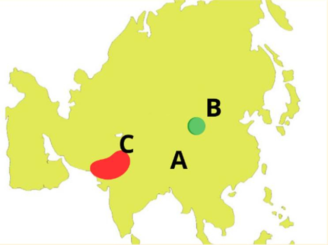 A to Jangcy, najdłuższa rzeka Azji. B to Huang He, Żółta Rzeka, przy której zaczęła się cywilizacja chińska. C to Indus, przy którym rozwinęła się cywilizacja indyjska.