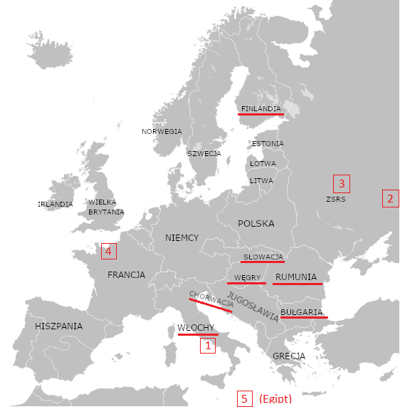 Państwa będące sojusznikami Niemiec podczas II wojny światowej – należy podkreślić następujące nazwy państw: Włochy, Węgry, Rumunia, Słowacja, Bułgaria, Chorwacja, Finlandia.