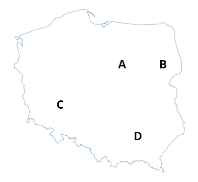 Zaznacz na mapie w pustych polach w odpowiednich miejsca litery odpowiadające Mazowszu, Podlasiu, Dolnemu Śląskowi, Małopolsce.