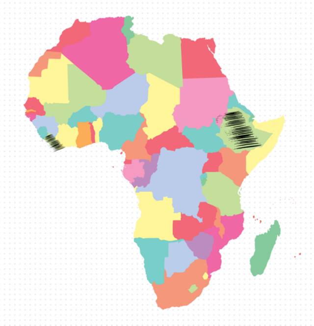 Zaznaczone kraje to: Liberia na zachodzie, Etiopia na wschodzie