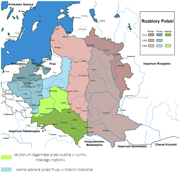 Zamaluj na mapie obszar, który zagarnęły Prusy w wyniku trzeciego rozbioru Polski i uzupełnij legendę.
