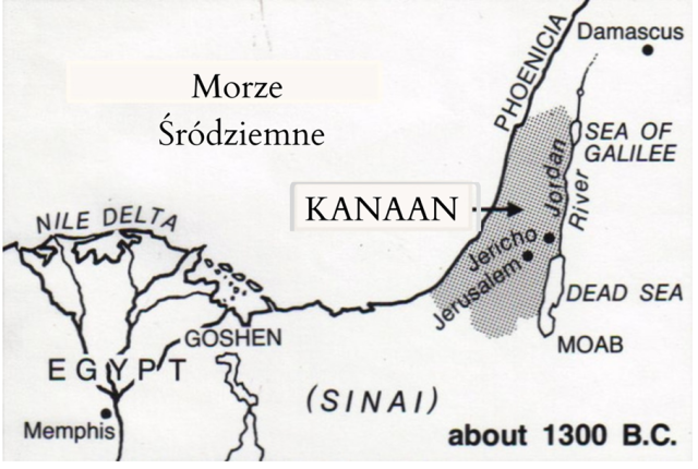 Na mapie w podręczniku kraina Kanaan, zwana również „Ziemią Obiecaną” znajduje się na styku dwóch strzałek – fioletowej i czerwonej.