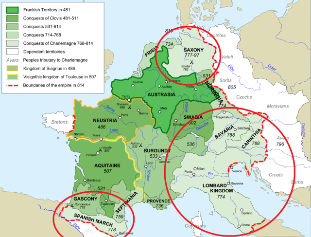 Karol Wielki przyłączył do państwa Franków północną Hiszpanię, Italię (po Rzym), Bawarię, Marchię Wschodnią, Marchię Serbską i Saksonię.